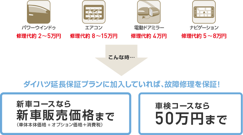 一般保証・特別保証終了後の修理は有料となりますが、ダイハツ「延長保証プラン」に加入していれば、万が一の故障でも安心!