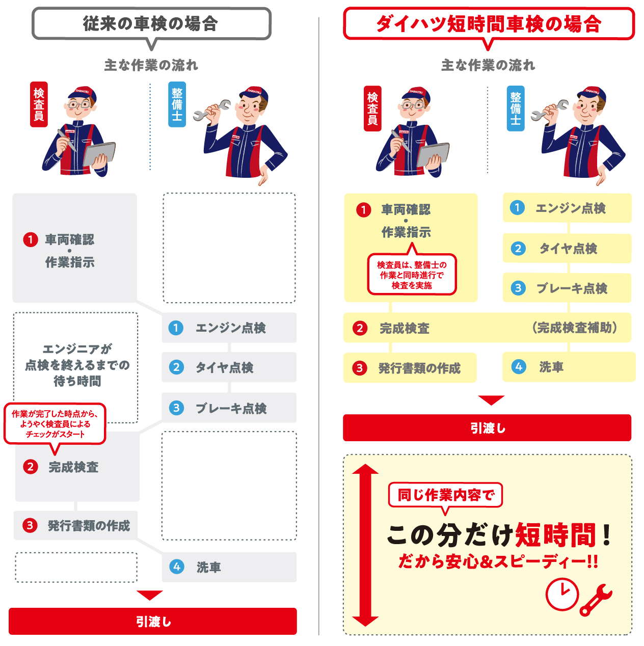 整備士と検査員が点検箇所を分担して、車検整備。だから短時間なのに、安心で確実な整備を実現!