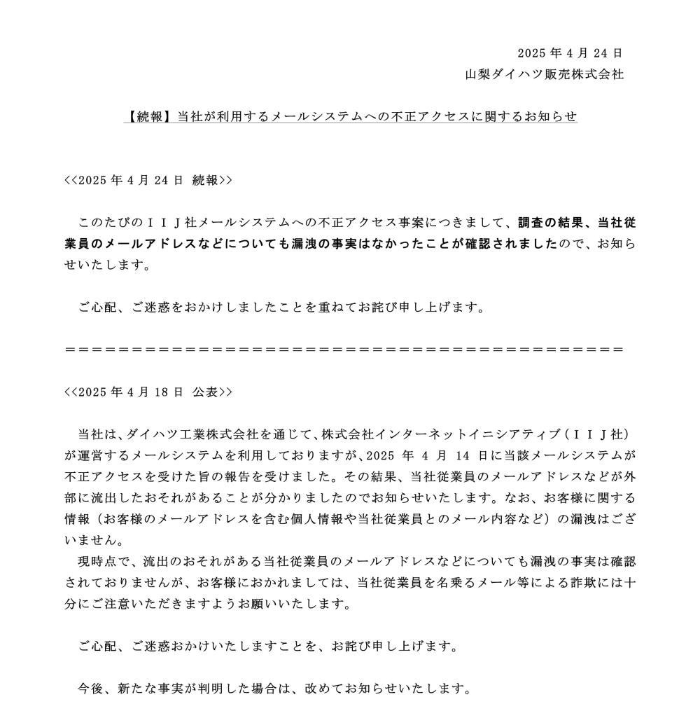 【続報】当社が利用するメールシステムへの不正アクセスに関するお知らせ