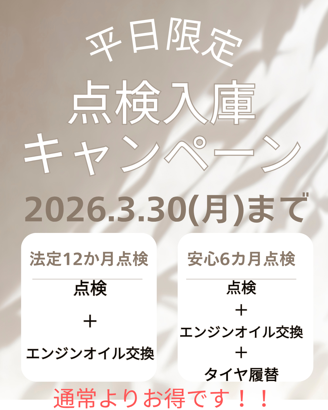 3月平日限定で、通常よりも点検がお得です🎵