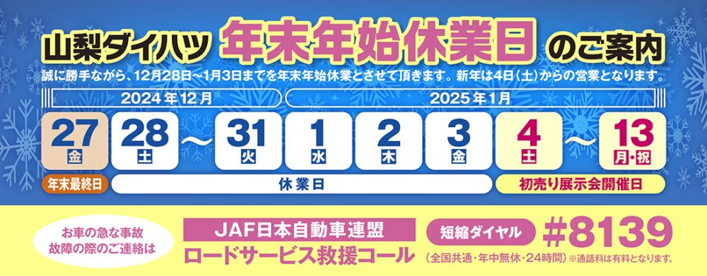 本日は、山梨ダイハツの冬季休業のお知らせです。