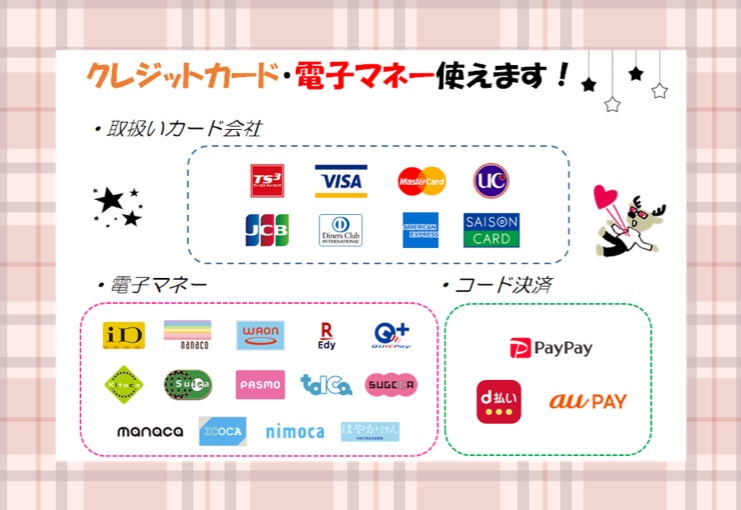 クレジットカードの他にも電子決済やQRコード決済等をご利用いただけます💳