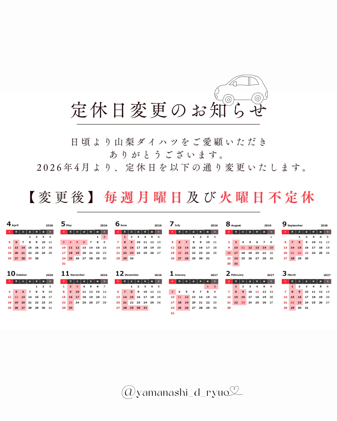 2026年4月より定休日が変更となりますのでお知らせいたします📢
