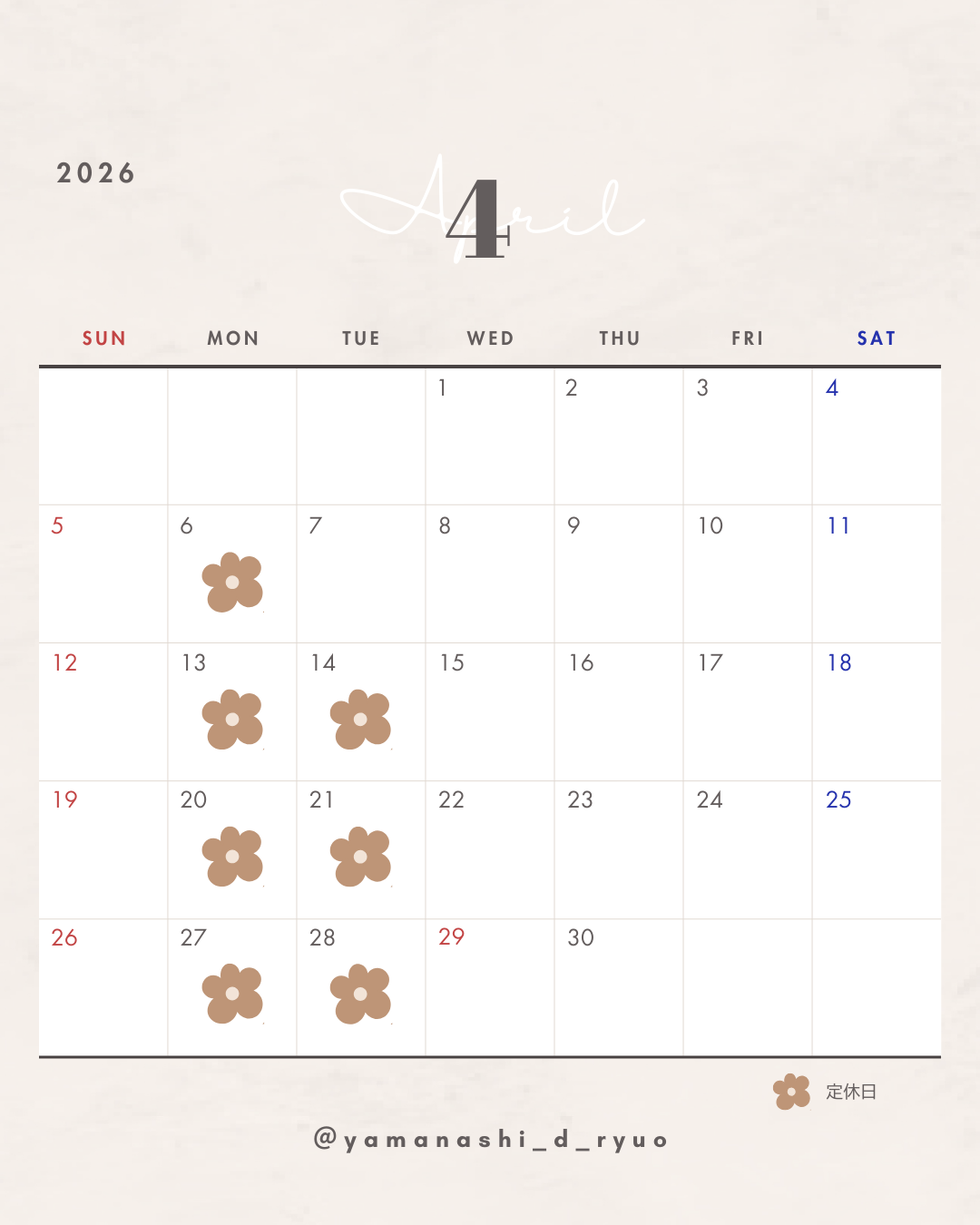 4月の定休日のお知らせです📢