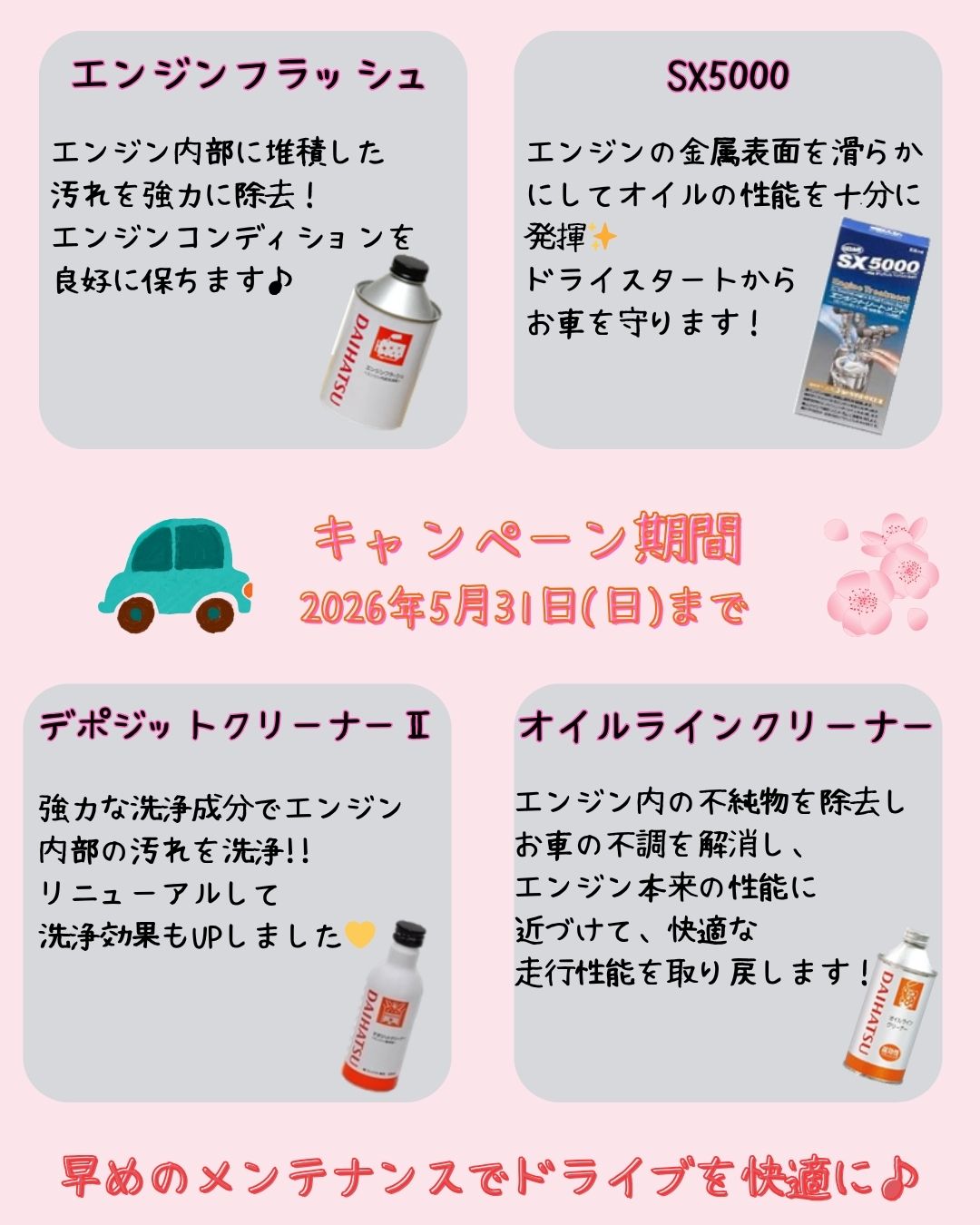 ダイハツ都留店です(^^)/ 春のオイルメンテナンスキャンペーン実施中! 購入商品が増えるごとに お値引きさせていただきます♪ まとめてご購入いただくと とてもお買い得です💛 今回の対象商品は ・エンジンフラッシュ ・SX5000 ・デポジットクリーナーⅡ ・オイルラインクリーナー の4点です(^^ゞ ワンダフルパスポート会員の お客様はさらに5%OFF!(^^)! ぜひ、点検や車検のご来店時に ご一緒にいかがでしょうか? キャンペーンは5月31日まで(*‘∀‘) お気軽にお問い合わせください♬ 明日、明後日は 展示会を開催いたします! 皆さまのご来店 お待ちしております(^^)/~