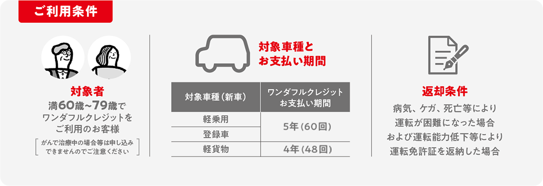 • 満60歳~79歳で、軽乗用・登録車はワンダフルクレジット5年を、軽貨物はワンダフルクレジット4年をご利用いただいたお客様がご加入いただけます。