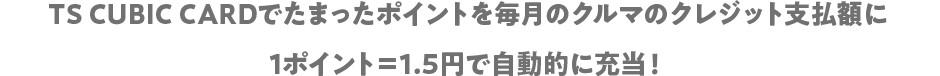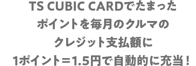 ●クレジットご契約後のお申込はできません。 ●お車のクレジット1契約に対して複数のカードのポイントキャッシュバックはできません。 ●キャッシュバックされるポイントは、カードのご利用明細書、または会員さま専用WEBページやカードアプリでご確認ください。 ●キャッシュバック期間はお車の当初クレジット契約の期間内となりますので、ワンダフルクレジットの再分割期間、支払い期間延長は対象となりません。 ●TS CUBIC CARDで毎月のお車のクレジットをお支払いいただくことは出来ません。 ●キャッシュバックはお車のクレジット支払へ充当されるものであり、クレジット一体型保険の払込額に充当されるものではありません。 |