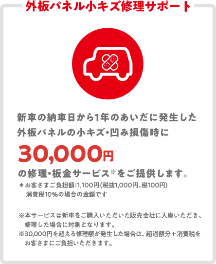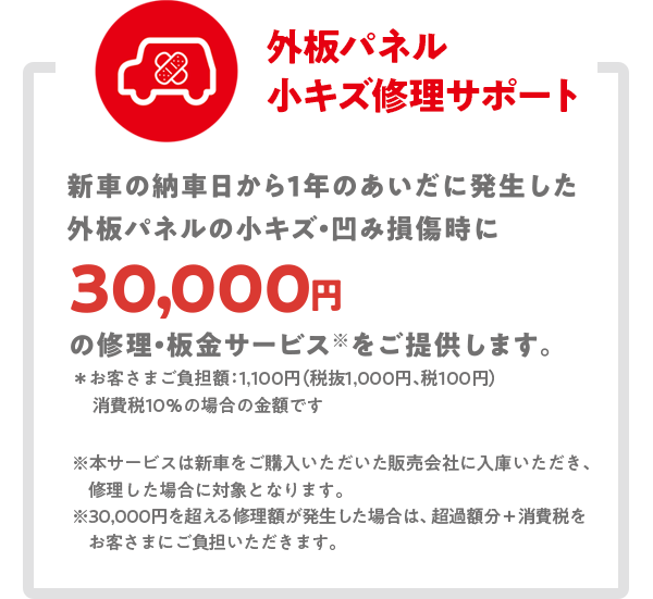 • 本サポートは、新車をご購入いただいた販売会社に入庫いただき、修理した場合に対象となります。