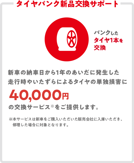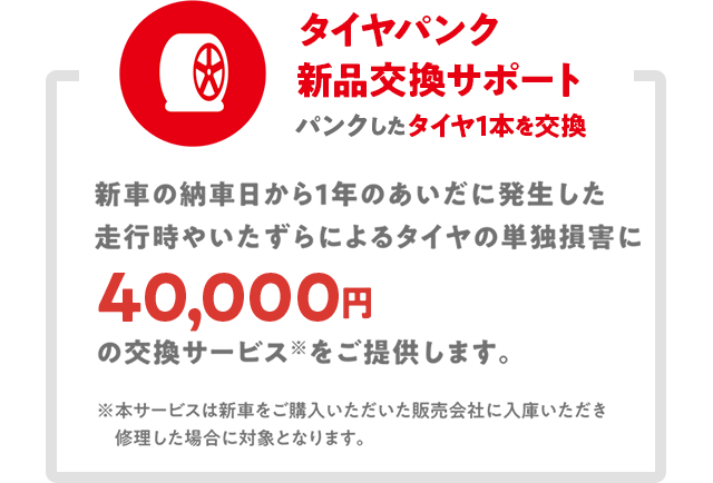 • 外板パネル小キズ修理サポートおよびタイヤパンク新品交換サポートは、いずれも保証期間中一回限りの提供となります。