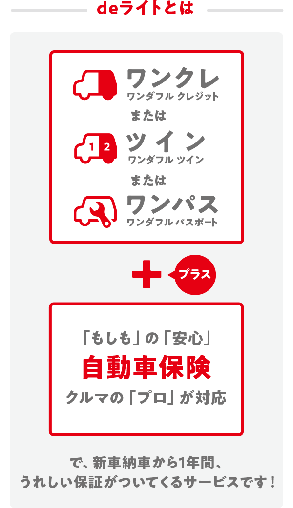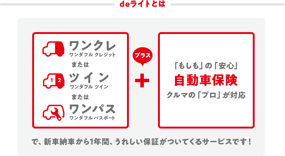 • 本サポートは、納車日時点で「自動車保険」と「ワンダフルパスポート」にご加入いただいているお客様、または納車日時点で「自動車保険」にご加入いただいており、「ワンダフルクレジット(ワンダフルツイン含む)」で新車を購入されたお客様が対象となります。